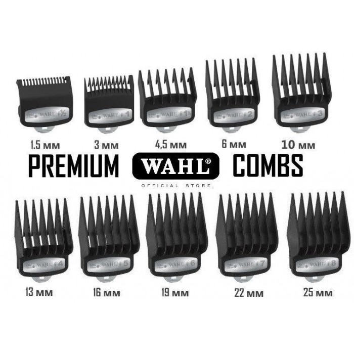Набір насадок для зміни довжини стриження з фіксатором. Надійні та дуже зручні насадки для машинок WAHL — не спадають і не ламаються, з правильною формою гребінки.