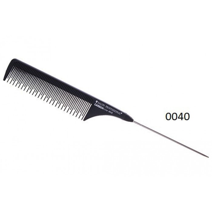 Salon Professional Carbon Line 0040 — гребінець-хвостик — незамінний перукарський інструмент для стриження, фарбування й укладання волосся. Гребінець зроблений із пластику чорного кольору, з рідкісними зубчиками. Можна мити та дезінфікувати.